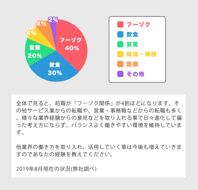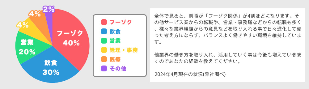 店長・副店長店長候補として、運営スタッフから積み重ねてグループの屋台骨として活躍してもらいます。業務は多岐に渡り責任・プレッシャーのある立場になります。業界未経験でもとにかくこの業界で頑張りたい人に向いています。